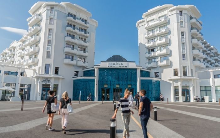C’est avec un regard neuf que le Groupe France Thermes, présidé depuis 2009 par Sylvain Serafini, expert en resorts thermaux et touristiques, décline son concept de resort thermal : rassembler au sein d’un même lieu le thermalisme médicalisé, les soins de bien-être, les activités physiques, les ateliers et conférences « cuisine santé », l’hébergement et un restaurant nutri-gastronomique. France Thermes a investi 35 millions d’euros dans la construction d’Aiga resort thermal, complexe à forte identité architecturale de 15 000 m2 et prévoit d’accueillir 10 000 curistes à l’horizon 2025.