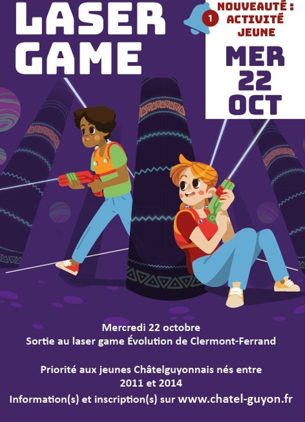 Le mercredi 22 octobre après-midi, le Pôle Vie de l’Enfant organise une sortie laser-game destinée aux jeunes de 11 ans à 15 ans (nés entre 2011 et 2014). Les jeunes seront accompagnés par deux animateurs vers le laser-game Évolution de Clermont-Ferrand, en bus. 16 places sont disponibles.