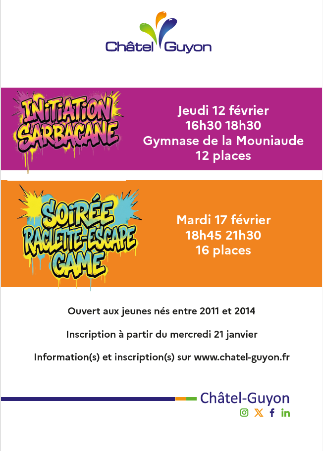 Pendant les vacances de février 2026, le service Jeunesse de la Ville de Châtel-Guyon organise deux activités à destination des jeunes nés entre 2011 et 2014 ! Les inscriptions seront ouvertes le mercredi 21 janvier.
