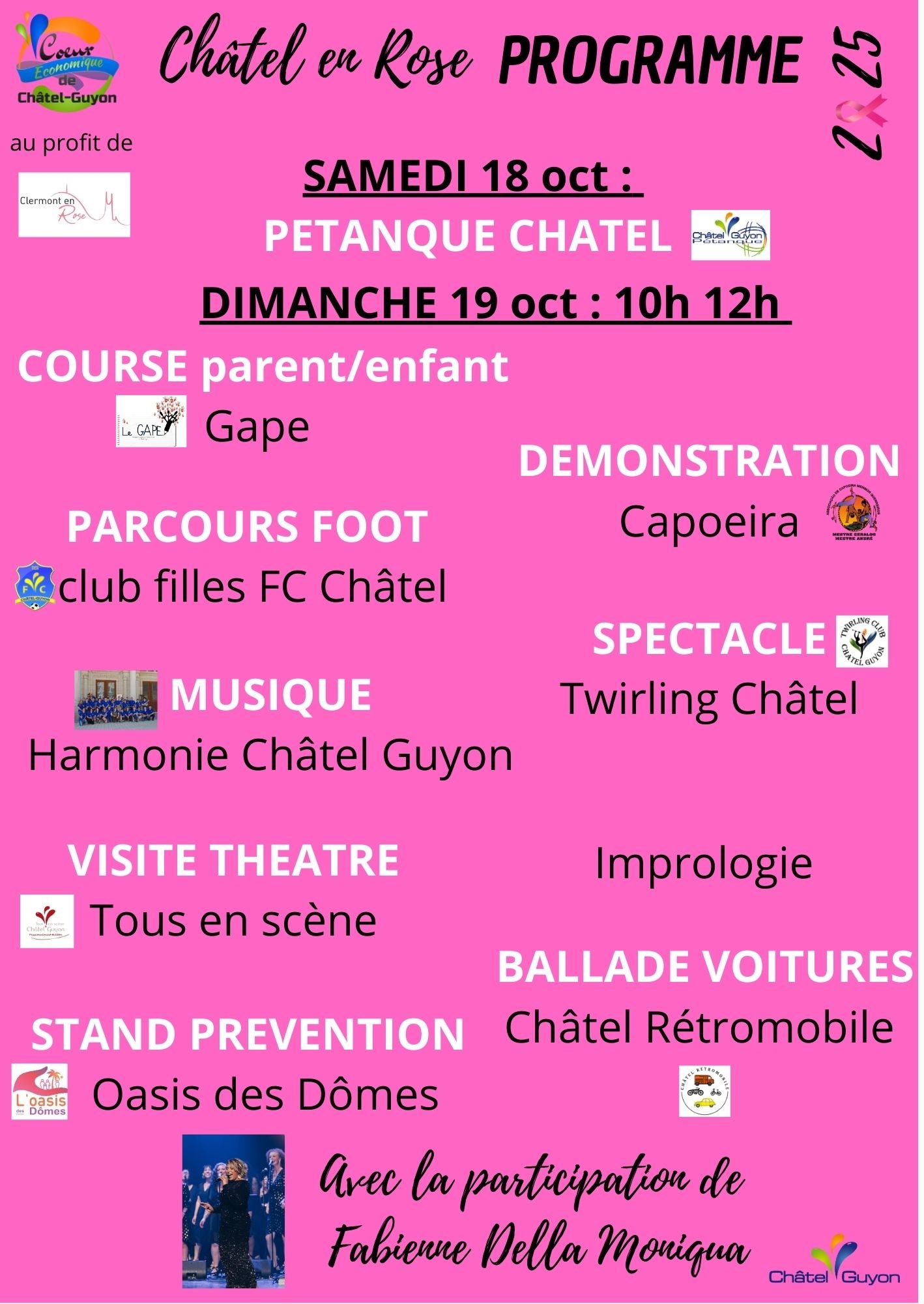 CHÂTEL EN ROSE Samedi 18 octobre : Concours de pétanque "Octobre en Rose" Concours de pétanque 100% féminin en doublette dont les bénéfices seront reversés à l'association "Octobre rose" Cour de la Mouniaude - 14h30 - 10€ la doublette Rens. : 06 87 75 83 28 Dimanche 19 octobre : L'association Coeur Economique vous invite [...]