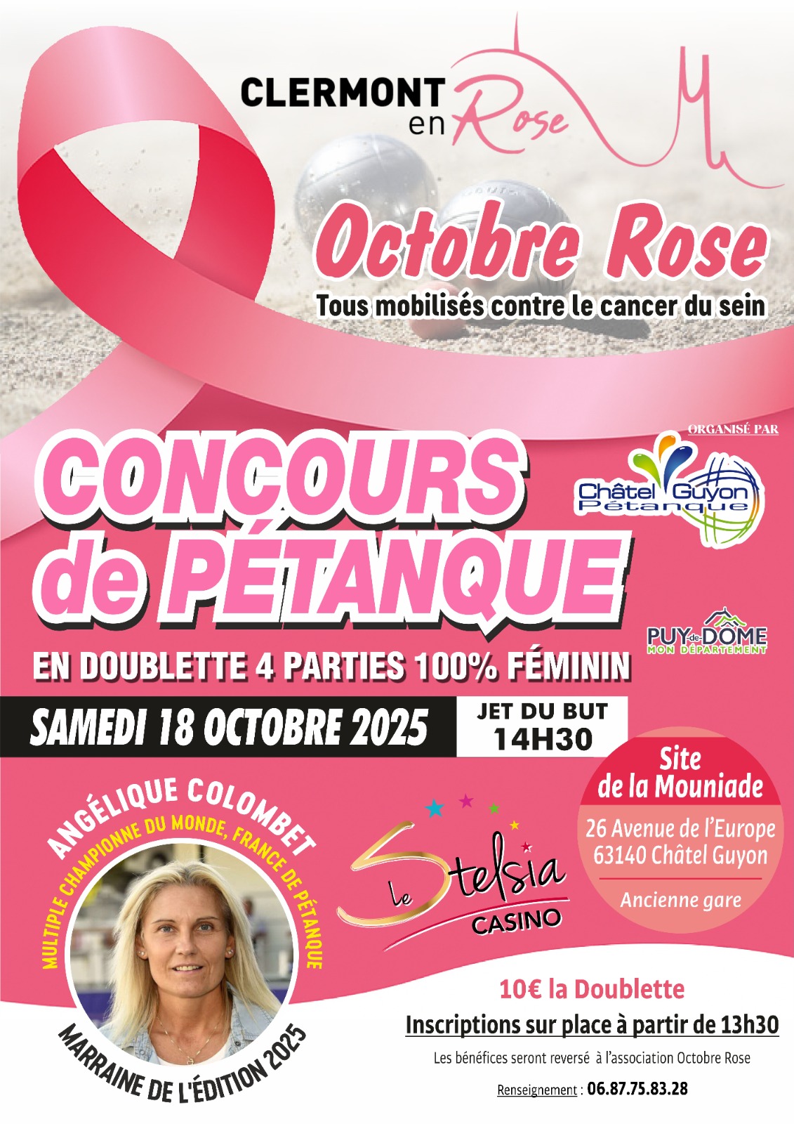 Centre culturel de la Mouniaude Avenue de l'Europe, Châtel-Guyon, FranceConcours de pétanque en doublette 4 parties 100% Féminin Au profit de l'association Octobre Rose Site de la Mouniaude - Jet du but : 14h30 Inscription à partir de 13h30 sur place - 10€ la Doublette Rens. : 06 87 75 83 28