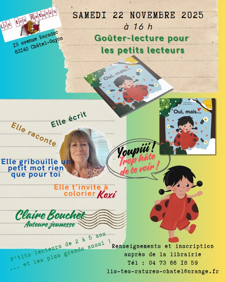 LECTURE DE CONTE par l’autrice Claire Bouchet suivie d'une séance de dédicaces. Librairie Lis-tes-Ratures – 16h30 – Gratuit - Sans inscription Rens. : 04.73.66.18.59 ou lis-tes-ratures-chatel@orange.fr