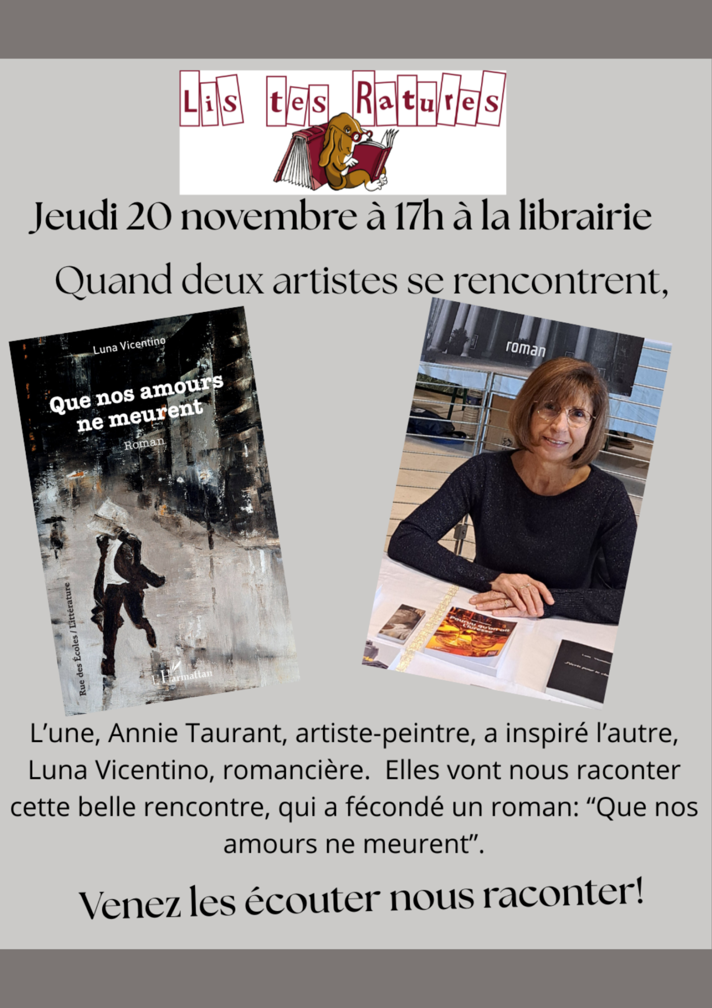La première a inspiré la seconde, un roman est né: "Que nos amours ne meurent" (Editions L'Harmattan). Librairie Lis Tes Ratures - 17h00 - Gratuit/Sans inscription Rens. : 04 73 66 18 59